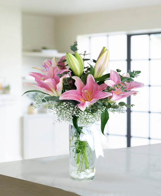 De estilo romántico es este Ramo Flores Islandia en tonos rosas y blancos. ¡Qué mejor que empezar un gran día con el regalo perfecto! Es un detalle bonito y especial. Un bonito ramo de flores de regalo a domicilio, realizado con lilium oriental, paniculata y bonitos verdes como el eucalypthus. Un poco de nuestra naturaleza trasladado a un bonito ramo de flores.